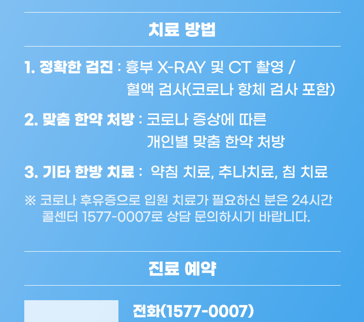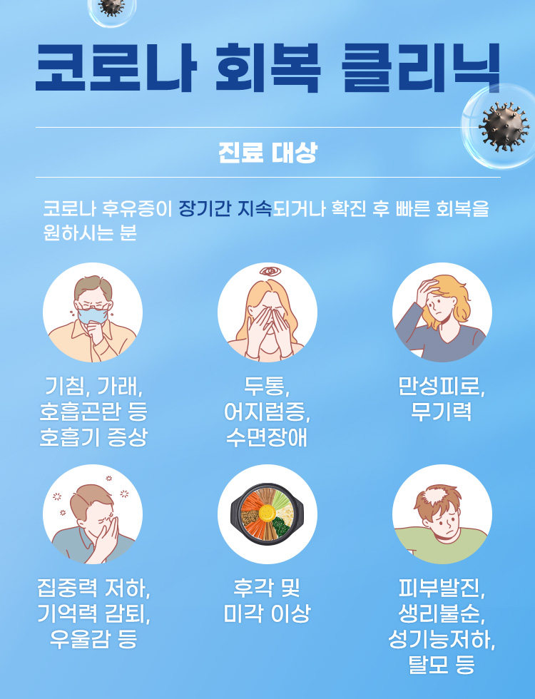 코로나 회복 클리닉 / 진료대상 - 코로나 후유증이 장기간 지속되거나 확진 후 빠른 회복을 원하시는 분 - 기침, 가래, 호흡곤란 등 호흡기 증상 - 두통, 어지럼증, 수면장애 - 만성피로, 무기력 - 집중력 저하, 기억력 감퇴, 우울감 등 / 후각 및 미각 이상 / 피부발진, 생리불순, 설기능저하, 탈모 등