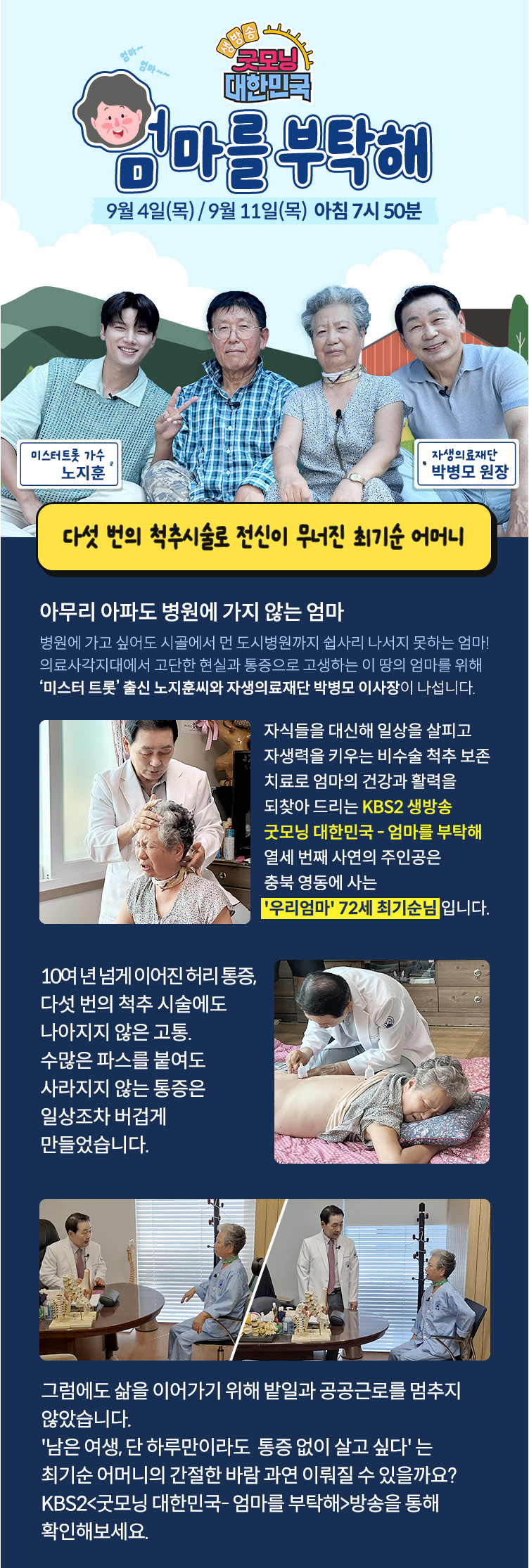 KBS 방송안내 / KBS2 생방송 굿모닝 대한민국 - 엄마를 부탁해 / 방송일 9.4(목), 9.11(목) am 7:50~ / 다섯번의 척추 시술로 전신이 무너진 최기순 어머니 / 아무리 아파도 병원에 가지 못하는 엄마. 병원에 가고 싶어도 시골에서 도시 병원까지 가는 길이 멀고 쉽지 않은 엄마. 의료 사각지대에서 고단한 현실과 통증 속에 살아가는 이 땅의 엄마들을 위해 ‘미스터트롯’ 출신 가수 노지훈 씨와 자생의료재단 박병모 이사장이 함께합니다. 자식들을 대신해 일상을 살피고, 자생력을 키우는 비수술 척추 치료로 엄마의 건강과 활력을 되찾아 드리는 KBS2 생방송 <굿모닝 대한민국 – 엄마를 부탁해> 열세 번째 사연의 주인공은 충북 영동에 사는 ‘우리 엄마’, 72세 최기순 어머니입니다. 10여 년 넘게 이어진 허리 통증, 다벗 번의 척추 시술에도 나아지지 않은 고통. 수많은 파스를 붙여도 사라지지 않는 통증은 일상조차 버겁게 만들었습니다. 그럼에도 삶을 이어가기 위해 밭일과 공공근로를 멈추지 않았습니다. '남은 여생, 단 하루만이라도 통증없이 살고싶다'는 최기순 어머님의 간절한 바람 과연 이뤄질 수 있을까요? kBS2<굿모닝 대한민국-엄마를 부탁해>방송을 통해 확인해보세요.
